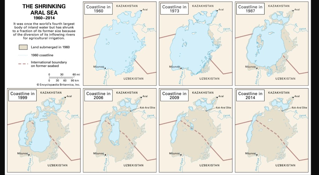 According to Encyclopedia Britannica, Aral sea was once used to be the fourth largest lake in the world covering an area of 68,000 square kilometers in Central Asia. Unfortunately, this was profoundly correct up until 1960 however, due to unsustainable water withdrawal practices done initially by USSR (Union of Soviet Socialist Republics) and after its collapse in 1992 then carried on by Uzbekistan, the water volume in the Aral sea started to drop sharply. As a consequence of wrong policies in place, Aral sea that was once the fourth largest lake in the world (in 1960s) appeared more to be like a pond (in 2014), when compared to its former size. The map given below is an intellectual property of Encyclopedia Britannica and is shared here only to highlight the consequences of wrong policies in place.
