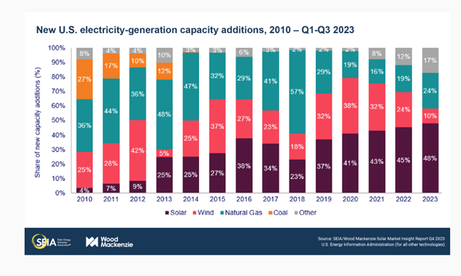 Summing up all, as per the Solar Energy Industries Association (SEIA), almost 48% of the new electricity generation capacity added in United States of America between Q1 – Q3 (2023) was solar PV technology. The same figure was just 4% in terms of new installed solar PV capacity back in 2010 (between Q1 – Q3). The graph given below is an intellectual property of SEIA & Wood MacKenzie and is shared here for educational purpose only:
