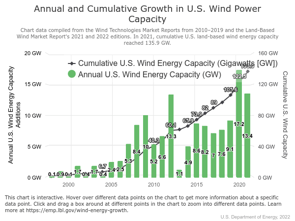 According to the Office of Energy Efficiency and Renewable Energy, USA installed 13.4 GWs of new windpower capacity in 2021. This brings the cumulative installed windpower capacity to 136 GWs in United States of America. 2020 was equally an excellent year for installed windpower capacity as USA installed a cumulative 17.2 GWs. Thus, the country installed a cumulative 30.6 GWs of windpower capacity in 2020 and 2021. However, not all the previous years experienced such an exponential growth for an installed windpower capacity in the country. In 1998, USA had a cumulative installed windpower capacity of 1.5 GWs and the country had barely added 0.1 GWs to its cumulative installed windpower capacity during the same year. In 1999, the country added another 0.9 GWs to its cumulative capacity bringing it to a total of 2.4 GWs. In 2000, again only 0.1 GWs of windpower capacity was installed bringing the new total to 2.5 GWs.