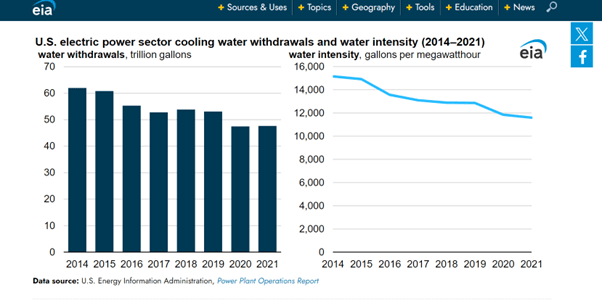 Coal is certainly the most water intensive source of electricity production. In USA, coal power plants on average used 19,185 gallons of water to produce a megawatt hour of electricity in 2021. On the contrary, natural gas combined-cycle generation consumed 2,803 gallons of water to produce a megawatt hour during the same time period. Thus, coal based power plants on average used 6 times more water per megawatt hour of electricity production than natural gas combined-cycle generation. Renewable energy technologies like windpower and solar PV do not need cooling water and thus have a very low water withdrawal intensity than coal and natural gas based power plants.